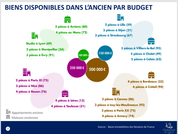 En attendant, les notaires de France ont pointé les grandes disparités régionales, comme l’illustre le visuel ci-dessus. Pour s’offrir un 3 pièces à Amiens ou un 4 pièces au Mans, un budget de 100.000 euros suffit. Mais il faudra débourser 500.000 euros pour acheter dans l’ancien, un 2 pièces dans le XI° à Paris ou un 4 pièces à Rouen. Et même 500.000 euros pour devenir propriétaire d’un 3 pièces à Cannes ou dans le 20° à Paris.