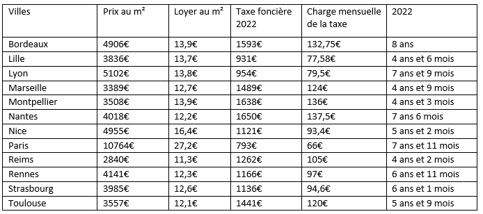 A Bordeaux, il faut patienter 8 ans pour que l’acquisition batte la location. Et ce, en raison du prix d’achat élevé (4 906 €/m²) et du poids de la taxe foncière (1 593 € en moyenne en 2022, soit près de 133€ par mois).