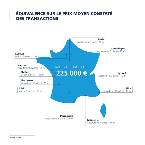 Cette inflation immobilière masque une réalité plus hétérogène. Si les prix affichent une hausse en régions, c’est principalement dans les métropoles et les villes de plus de 30 000 habitants : + 6% à Lyon, + 3% à Marseille, + 3,2% à Toulouse, + 4% à Nice et + 5,4% à Nantes. Comme l’illustre la carte ci-dessus, les Français ne sont pas logés à la même enseigne. Plus le prix du mètre carré est abordable, plus ils peuvent acheter grand dans l’ancien.